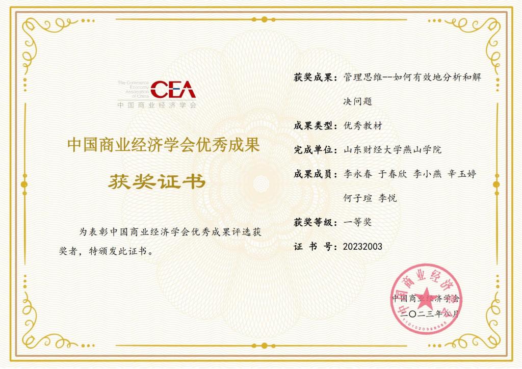 在剛剛結(jié)束的中國商業(yè)經(jīng)濟學會2023年度優(yōu)秀成果評獎活動中,由6776永利集團院長李永春教授主編的教材《管理思維---如何有效地分析和解決問題》榮獲優(yōu)秀教材一等獎。同時,在8月份進行的山東省第十五屆大學生科技節(jié)活動中,6776永利集團李永春、劉金煒指導的學生組榮獲山東省大學生智慧企業(yè)管理創(chuàng)新設計大賽數(shù)字商業(yè)企業(yè)模擬經(jīng)營對抗賽道一等獎。另外,在前不久公布的山東省教育科學研究院組織的2023年度山東省教育教學研究課題...